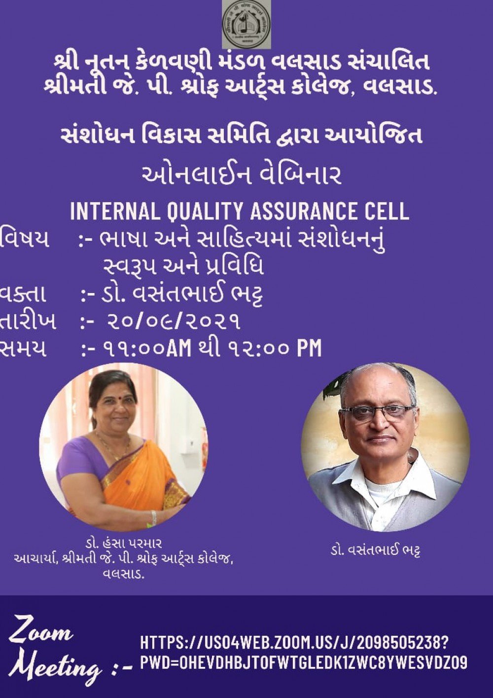 વ્યાખ્યાન શ્રેણીના અધ્યક્ષા – ડૉ. હંસા પરમાર (ઇ.આચાર્યા શ્રીમતી જે.પી.શ્રોફ આર્ટ્સ કોલેજ, વલસાડ)