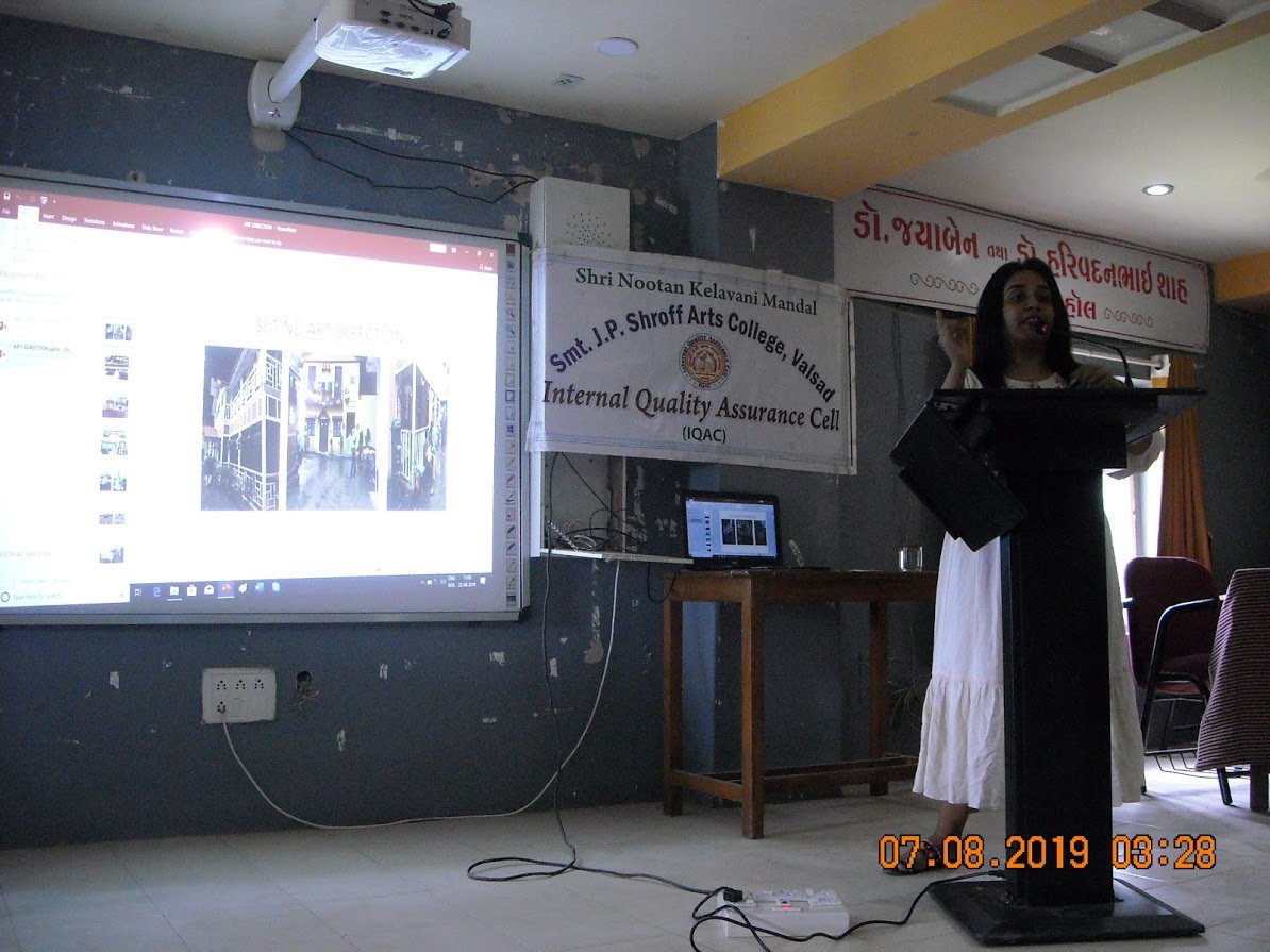 Department of Home Science: A lecture was delivered by Alumni Hiral desai on stage desining & Art direction with P. P. T. on 22nd August 2019 at 10:30 No. of participant -- 55